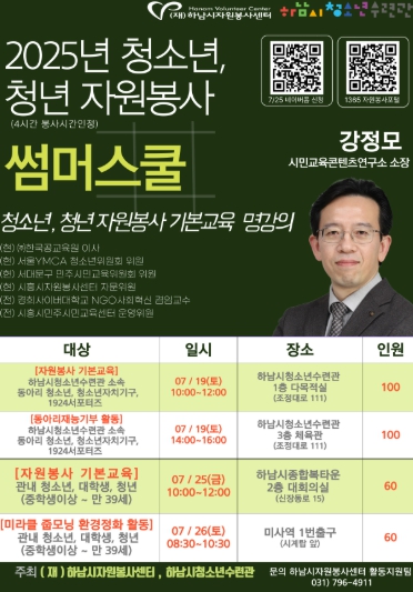 오는 7월 19일에는 하남시청소년수련관(조정대로 111)에서 YES청소년동아리 25팀, 청소년자치기구, 1924서포터즈 학생들을 대상으로 자원봉사 기본교육을 실시한다. 이번 교육은 시민교육콘텐츠연구소 강정모 소장이 강사로 초청되어 자원봉사의 의의와 역할에 대해 심도 있는 강의를 진행할 예정이다.