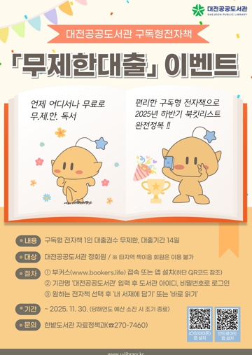 한편, 대전공공도서관은 구독형 전자책 활성화를 위해 6월 23일부터 7월 18일까지 ‘다독자 이벤트’를 진행한다. 전자책 이용 권수, 완독률, 독서 시간 등을 기준으로 상위 60명의 다독자를 선정하여, 전자책 플랫폼 부커스를 통해 소정의 경품을 제공할 예정이다.