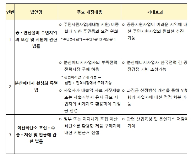 기후에너지환경부는 이날 국회를 통과한 3개 법률안이 정책 현장에서 차질없이 시행될 수 있도록 하위법령 정비 등 제반 여건 준비에 최선을 다할 예정이다.