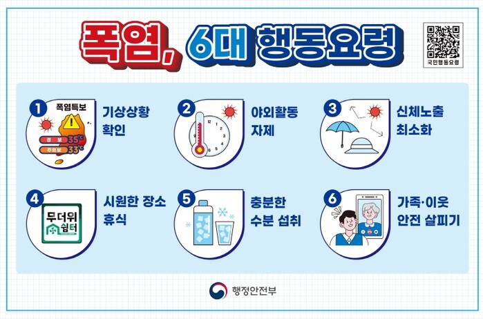 충청북도 정진훈 자연재난과장은 “도내 폭염경보 확대에 따라 재난안전대책본부 비상대응단계가 3단계로 격상된 만큼 도민 피해를 최소화하기 위하여 기존에 추진 중인 무더위쉼터 운영, 도심지 살수차 운행, 재난문자·마을방송·전광판 등을 활용한 위하여 도민행동요령 홍보와 더불어 분야별로 피해우려 상황에 대한 사전점검을 철저히 이행토록 하겠다.”고 말했다.