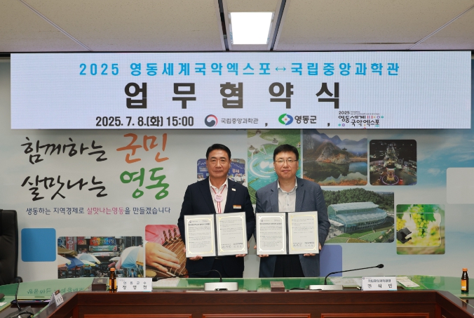 이번 협약식에는 정영철 영동세계국악엑스포 공동조직위원장과 권석민 국립중앙과학관장을 비롯한 양 기관 관계자 10명이 참석했다.