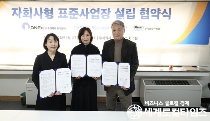 [세계로컬타임즈] 한국장애인고용공단 서울북부지사는(지사장 김정연, 이하‘공단’) 주식회사 원이앤에스(대표이사 지연관) 및 ㈜블루안메타(대표이사 이채현)와 1월 27일 10시 주식회사 원이앤에스 회의실에서 장애인 일자리 창출을 위해 「자회사형 장애인 표준사업장*」 설립을 위한 협약을 체결하였다.