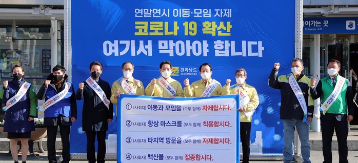 [세계로컬타임즈 김명진 기자] 전라남도는 13일 연말연시 이동 및 모임 자제를 호소하는 방역 캠페인을 개최하고, 도민의 적극적인 동참을 호소했다.