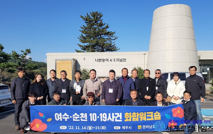 여순사건 화합워크숍은 여순사건유족회와 실무위원회‧자문위원회 위원, 중앙 여순사건지원단(단장 장헌범) 등이 지난 15일까지 이틀간 제주를 방문, 여순사건 및 제주4.3 유족 간담회, 제주4.3평화공원 등 제주4.3 유적지 방문, 제주도 선흘리 위령제 방문 일정으로 진행됐다.