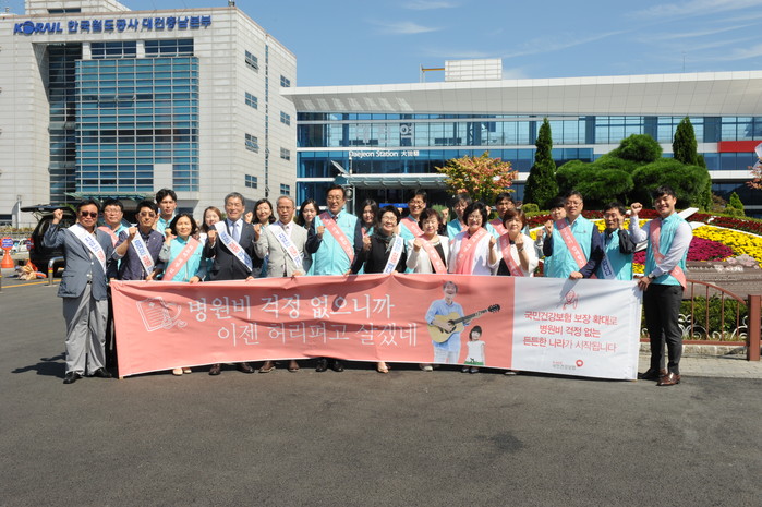 [세계로컬신문 라안일 기자]국민건강보험공단 대전지역본부는 대전소비자단체연합회와 대전약사회 치과의사회 및 간호사회 등 의약단체와 함께 21일 대전역 광장에서 보장성 강화 정책과 금연캠페인을 펼쳤다.