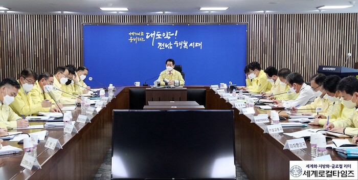 [세계로컬타임즈 김명진 기자] 김영록 전라남도지사는 18일 도 재난종합상황실에서 열린 가뭄대책 상황보고회에서 실국별 가뭄대책 추진상황을 점검하고, 해수담수화 등 가뭄 대책사업 조기 완료와 가정 및 기업의 물 절약 동참 호소를 당부했다.