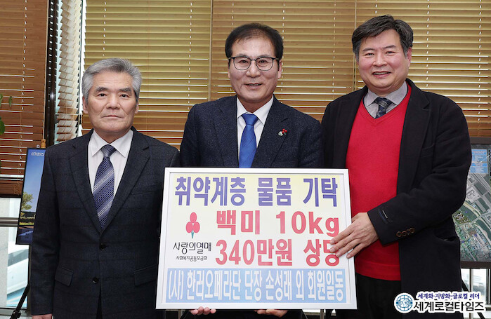 [세계로컬타임즈 이남규 기자] 한러오페라단이 지난 9일 어려운 이웃을 위해 340만 원 상당 백미 117포를 전남 함평군에 기부하고 기념촬영을 하고 있다. 손성래 단장은 “올해는 특별히 저의 고향인 함평군의 어려운 이웃들을 도울 수 있게 돼 매우 기쁘고 감회가 남다르다”고 말했다.