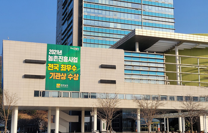| ▲농촌진흥청이 주관하는 ‘2021년도 농촌진흥사업 종합평가’에서 전국 최우수기관상을 수상, 현수막이 걸려 있다.[사진=전남도청사] |