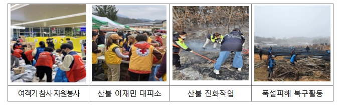 경북·경남·울산 지역 산불 현장에서는 3만여 명의 자원봉사자가 배식 봉사, 환경정화, 임시주택 입주 청소 등을 지원했다.