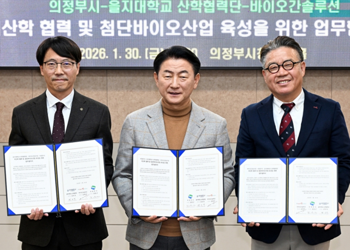 의정부시는 1월 30일 시청 회룡홀에서 을지대학교 산학협력단(단장 김인식), ㈜바이오간솔루션(대표 송명석)과 ‘지산학 협력 및 첨단 바이오산업 육성을 위한 업무협약’을 체결했다.