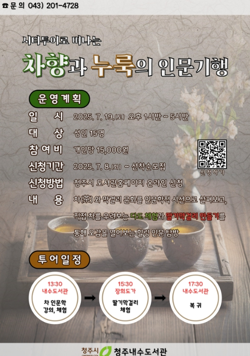 이번 프로그램은 청주시 시티투어와 연계해 전통 차와 막걸리 문화를 인문학적으로 탐색하고 직접 체험해보는 특별한 일정으로 구성됐다.