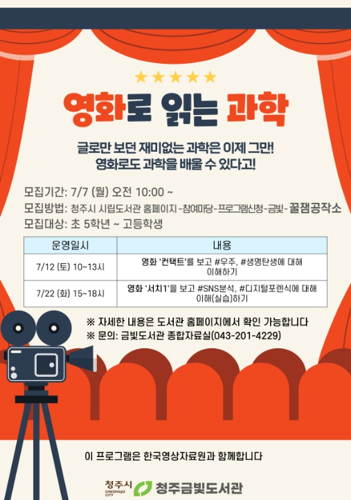 청주금빛도서관 관계자는 “이번 특강은 단순한 영화 감상을 넘어 과학적 사고를 키우고 진로 탐색의 기회를 제공할 것”이라며, “미래 과학자를 꿈꾸는 청소년들에게 유익한 시간이 될 것으로 기대한다”고 전했다.