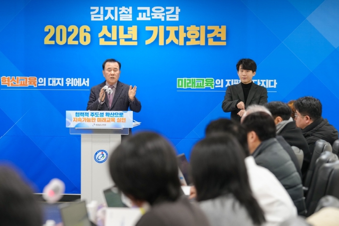 [세계로컬타임즈] 김지철 충남교육감은 8일, 도교육청 회의실에서 ‘2026 신년 기자회견’을 열고, ‘2025년 주요 성과와 2026년 12대 중점 추진 과제’를 발표했다.