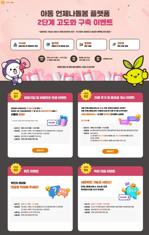 이벤트는 아동언제나돌봄플랫폼에 접속해 참여할 수 있으며 ▲신규 회원가입 또는 기존 비밀번호 변경 참여자 2,000명 ▲퀴즈 참여자 500명 ▲축하 댓글 참여자 500명 ▲서비스 이용후기 작성 등 이벤트 참여자 100명(참가상 추첨 50명, 심사(우수 40명, 최우수 10명)) 등 총 3,100명에게 모바일 쿠폰이 증정된다. 당첨자는 12월 중 플랫폼을 통해 발표할 예정이다.