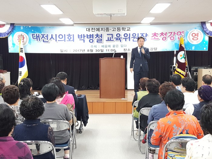 [세계로컬신문 라안일 기자] 대전시의회 박병철 교육위원장(대덕구 3, 더불어민주당)이 지난 30일 대전예지중·고등학교에서 특강을 했다.