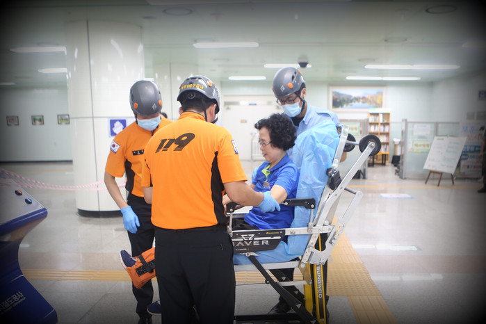 | ▲ 24일 대전 현충원역에서 실시된 지하철 테러 대비 민·관·군 합동훈련에서 119대원들이 부상승객으로 변한 시민을 구호하고 있다.<사진제공=대전도시철도공사> |