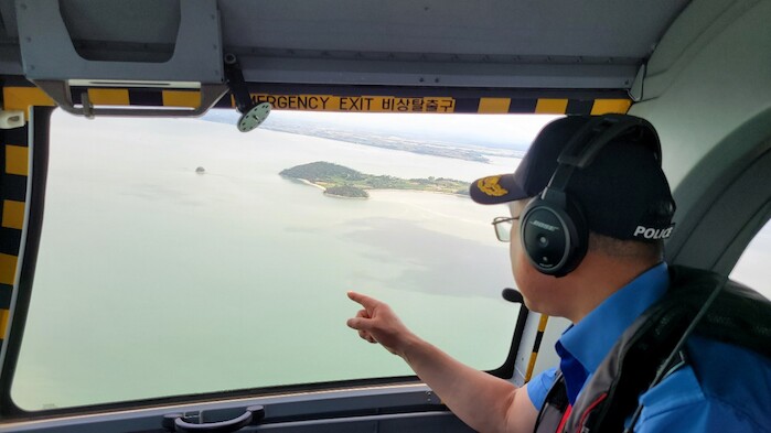 | ▲김종욱 서해지방해양경찰청장이 12일 헬기를 타고 기름유출사고가 발생한 전남 무안군 도리포 인근 해상을 순찰하고 있다.(사진=서해해경) |
