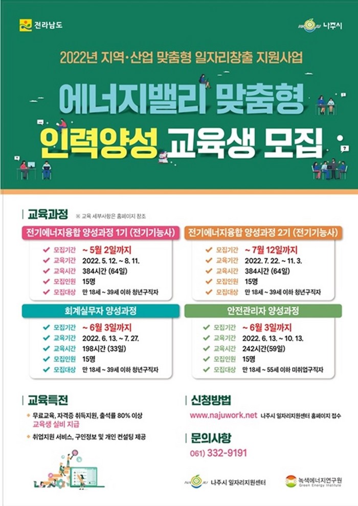 나주시 관계자는 “구인난 해결을 위해 근로 현장에 즉각 투입될 수 있는 자격증 취득 등 실무 위주에 중점을 두고 교육 커리큘럼을 구성했다”며 “앞으로도 에너지밸리를 비롯한 지역산업 여건에 맞는 인력 양성과 취업 연계를 통해 구인·구직 1:1매칭에 최선을 다하겠다”고 말했다.