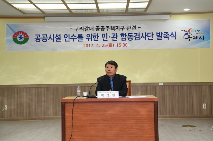 [세계로컬신문 고성철 기자] 경기도 구리시(시장 백경현)는 지난 25일 시청 회의실에서 관계 공무원과 최재혁 갈매지구연합회장 등 16명이 참석한 가운데‘구리갈매지구 민·관 합동검사단 발족식’을 열었다.
