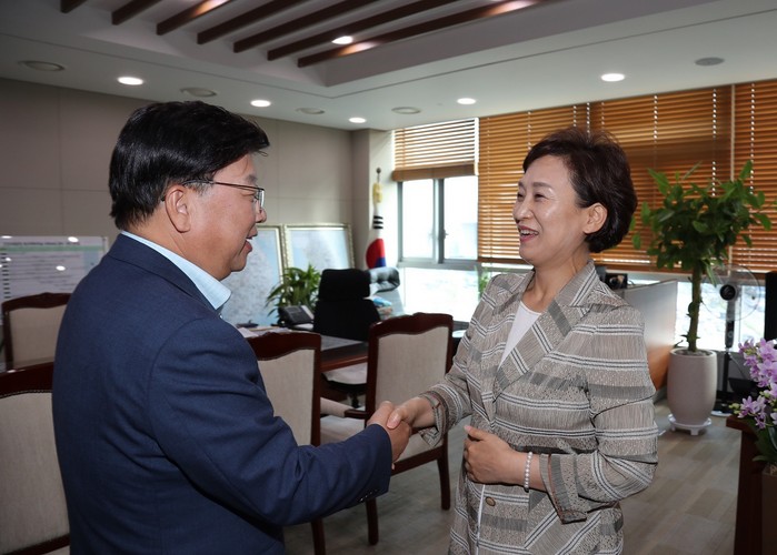 | ▲권선택 대전시장(왼쪽)이 13일 정부세종청사 국토교통부에서 김현미 장관을 만나 악수를 나누고 있다.<사진제공=대전시청> |