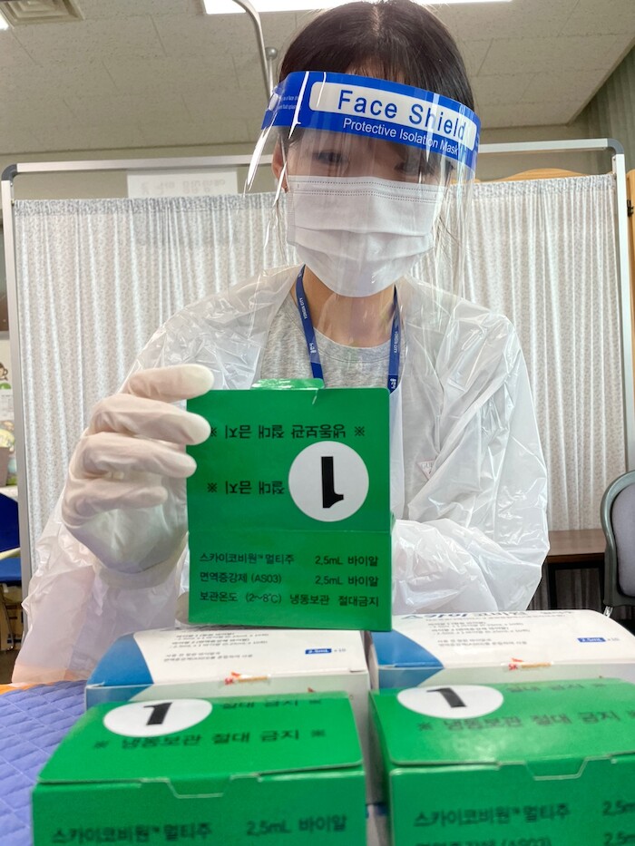 | ▲ 처인구보건소 관계자가 국산 코로나 백신인 스카이코비원 백신을 확인하고 있다. (사진=용인시) |