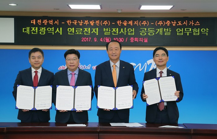 [세계로컬신문 오영균 기자]대전시가 4일 시청 중회의실에서 한국남부발전, 한솔제지, 충남도시가스와 친환경연료전지 발전사업 공동개발 업무협약을 체결했다.