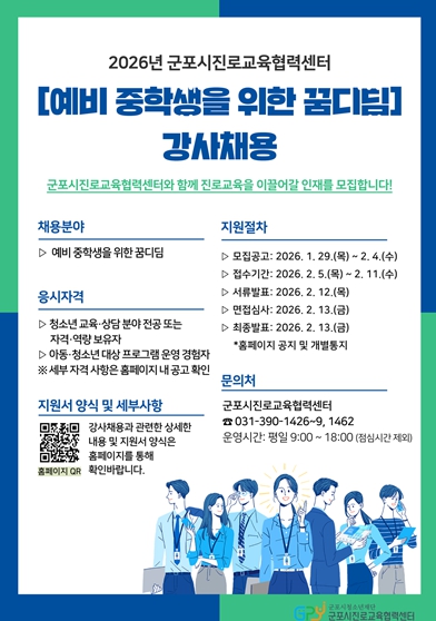 이번 강사 채용은 초등학교에서 중학교로의 학년 전환기를 앞둔 예비중학생을 대상으로, 중학교 생활 전반에 대한 이해를 높이고 진로 탐색과 자기 이해를 돕는 맞춤형 프로그램을 운영하기 위한 것으로, 총 3명 내외의 전문 강사를 선발할 예정이다.