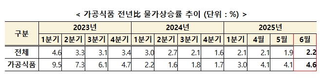 ’25.6월 가공식품 소비자물가 상승률은 전월 대비 0.3%, 전년동월 대비 4.6%이며, 품목으로는 초콜릿, 김치, 커피 등이 높은 상승률을 보였다.
