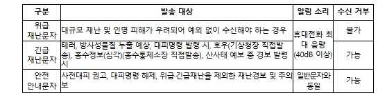 앞으로 주민 대피가 필요한 긴급 상황은 반드시 ‘위급재난문자’ 또는 ‘긴급재난문자’로 발송해 국민께 휴대전화 최대 음량의 알림 소리(40dB 이상 ‘삑’ 소리)로 위험 상황을 알린다.