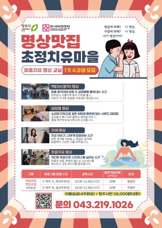 △움직임과 호흡으로 몸의 긴장을 풀고, 마음의 무거운 감정을 비워내는 ‘액티브(동적)명상’을 시작으로 △소리의 진동으로 깊은 이완과 평온에 닿는 사운드 테라피 ‘싱잉볼 명상’ △지금 이 순간, 나에게 집중하는 시간 ‘자애 명상’ △커다란 웃음으로 스트레스를 날리는 ‘웃음치유 명상’까지, 다양한 감각과 마음을 깨우는 명상 프로그램이 준비돼 있다.