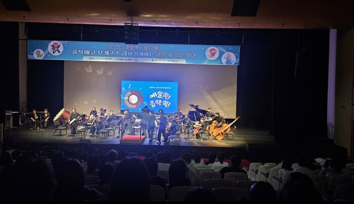 첫 순서인 ‘영화음악과 함께하는 오케스트라 향연’에서는 LED 영상과 해설이 더해진 음악회가 펼쳐지고, 충북예술고 오케스트라와 전문 연주자 6명이 함께 무대에 올라 학생들에게 생생한 공연을 선사했다. 이어지는 ‘음악공간 탐방과 체험’에서는 음악, 미술, 무용 공연실과 작업실을 둘러보고 예술 키링 만들기 체험을 진행했다.