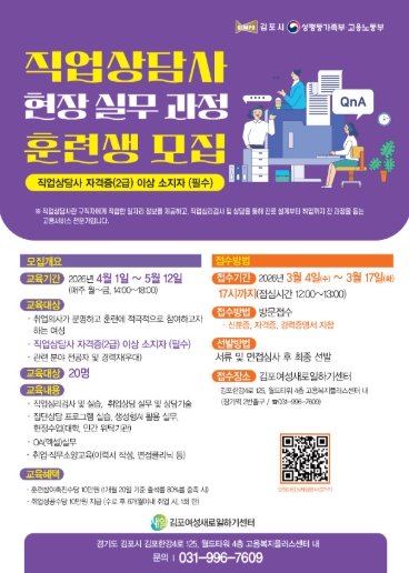 김포새일센터는 이번 직업교육훈련 외에도 취업 상담, 동행 면접, 새일 여성 인턴 사업 등 종합적인 취업 지원 서비스를 상시 운영하고 있다.