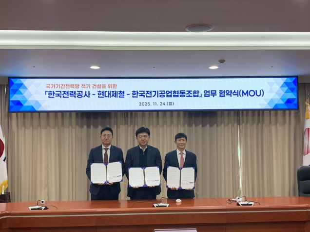 한전은 11월 24일 전남 나주 본사에서 현대제철 및 협동조합과 ‘국가기간 전력망 적기 건설을 위한 업무협약‘을 체결했다. 이는 급증하는 송전망 건설 수요에 대비해 철탑 원자재 공급–제작–납품 간 밸류체인을 강화하고, 안정적인 전력망 건설을 가속화 하기 위한 것이다.
