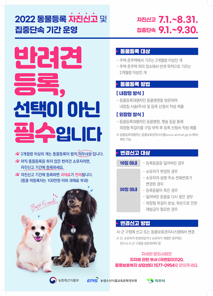 또한 이미 등록했더라도 반려견의 소유자, 소유자 주소·전화번호, 반려견의 상태(유실, 되찾음, 사망) 등 변경사항이 있는 경우 목포시 농업정책과 또는 동물보호관리시스템에 변경·신고해야 한다.