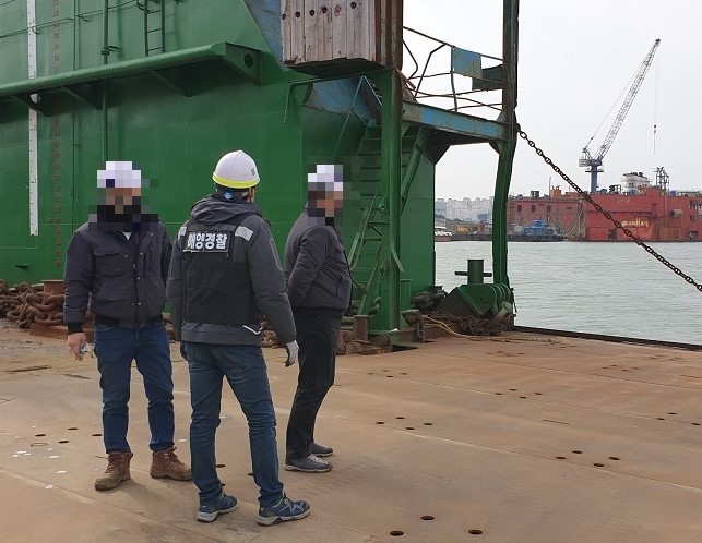 | ▲목포해경이 산정단지 내 조선소에서 해양오염 관련 일제 점검을 실시하고 있다. (사진=목포해경) |