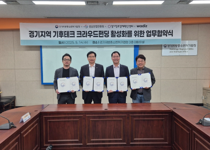 [세계로컬타임즈] 성남산업진흥원은 5월 14일 경기지방중소벤처기업청,경기창조경제혁신센터 및 와디즈임팩트(주)와 함께 ‘기후테크 크라우드펀딩 활성화를 위한 업무 협약’을 체결했다.