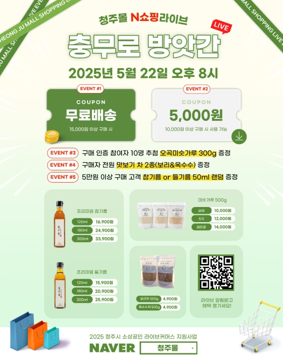 방송 중에는 △1만5천원 이상 구매 시 무료 배송 △1만원 이상 구매 시 5천원 할인 △구매 인증 참여자 10명 추첨해 사은품(미숫가루 300g) 증정 △5만원 이상 구매고객에게 사은품 (기름 50ml)을 증정 등 이벤트가 적용된다.