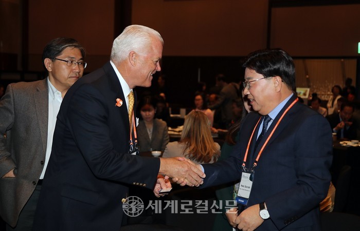 | ▲ 권선택 대전시장(오른쪽)이 19일 세계지식포럼에서 세계과학도시연합 관계자와 악수를 나누고 있다. <사진제공=대전시청> |