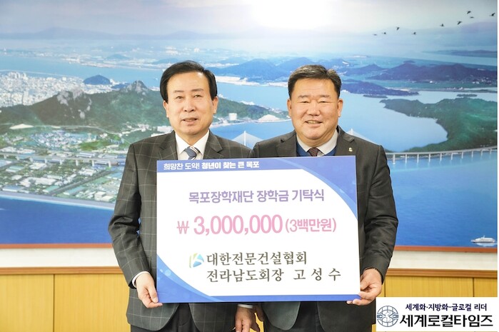 [세계로컬타임즈 김명진 기자] 대한전문건설협회 전라남도회(회장 고성수)가 지난 10일 재단법인 목포장학재단 이사장 박홍률 목포시장에 장학기금 3백만원을 기탁했다.