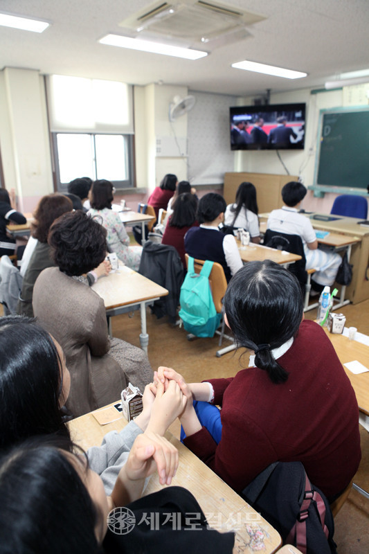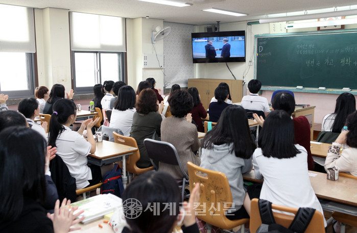 문재인 대통령과 김정은 위원장이 만나 악수를 나누는 순간 교실안 환호와 박수는 절정에 이르렀다.