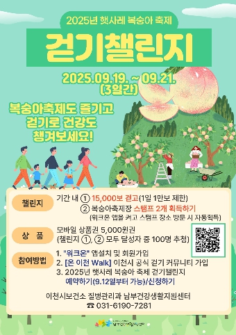 센터 관계자는 “향긋한 장호원 황도가 무르익는 가을을 맞아 복숭아 축제도 즐기고 걷기 챌린지에 참여해 건강도 챙기시길 바란다”라고 전하며, “이번 걷기 챌린지를 통해 시민들이 건강한 생활 습관을 실천하고 지역 축제에 관심과 참여를 높이는 계기가 될 것으로 기대된다”라고 말했다.