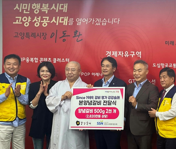 [세계로컬타임즈] ㈜전한의 외식브랜드 강강술래(대표 노상환)가 10월 10일, 고양특례시에 본양념갈비 500g 2,000개(2,820만 원 상당)를 기탁했다. 이번 전달식은 고양특례시청 열린시장실에서 진행됐으며, 이동환 고양특례시장, 김민숙 고양특례시의원(고양, 관산, 원신), 노상환 강강술래 대표, 김응화 고양시사회복지협의회 회장이 함께 자리했다.