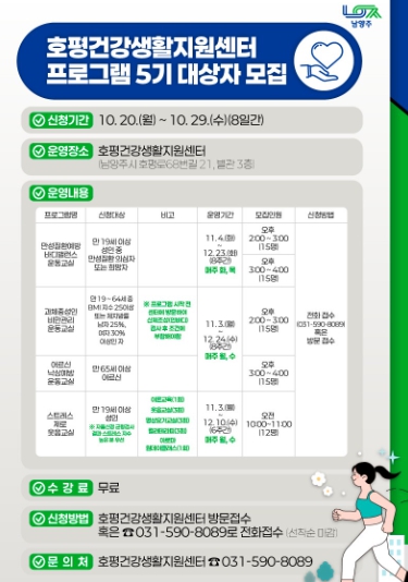 프로그램 신청은 10월 20일부터 29일까지 센터에 방문하거나 전화로 할 수 있으며, 자세한 사항은 호평건강생활지원센터를 통해 확인하면 된다.