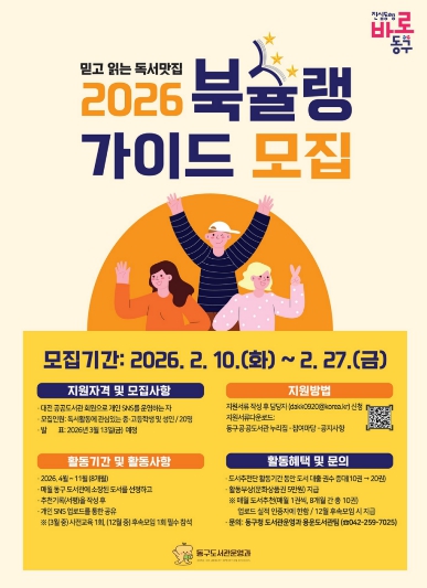 [세계로컬타임즈] 대전 동구는 책을 사랑하고 글쓰기에 관심 있는 구민을 대상으로, 2026년 동구 도서추천단 ‘북슐랭 가이드’를 모집한다고 10일 밝혔다.