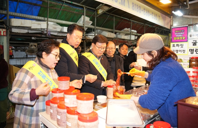 [세계로컬타임즈] 전북특별자치도의회는 설 명절을 앞둔 10일 군산 주공시장을 방문해 전통시장 상인들을 응원하며, 시장 활성화를 위한 장보기 행사와 이용 캠페인을 진행했다.