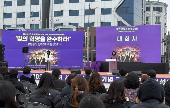 전남여성인권단체연합(회장 김수아)이 주최한 이날 행사에는 ‘빛의 혁명을 완수하라! 성평등이 민주주의의 완성이다’라는 주제로 지역 9개 민간단체 대표와 여성인권단체연합 회원 등 150여 명이 참석했다.