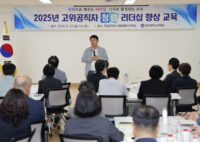 [세계로컬타임즈] 광주시교육청은 12일 시교육청 지방공무원어울배움터 마루실에서 본청 및 산하기관 4급(상당) 고위공직자 50여 명을 대상으로 ‘2025년 고위 공직자 청렴리더십 향상 교육’을 실시했다.
