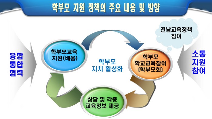 전남교육청은 ‘교사와 학부모 한편 되기’를 올해 슬로건으로 선정해 학부모와 교사가 서로 믿고 신뢰하며 아이들의 성장 발달을 위해 협력관계가 형성될 수 있도록 다양한 전략을 펼칠 예정이다.