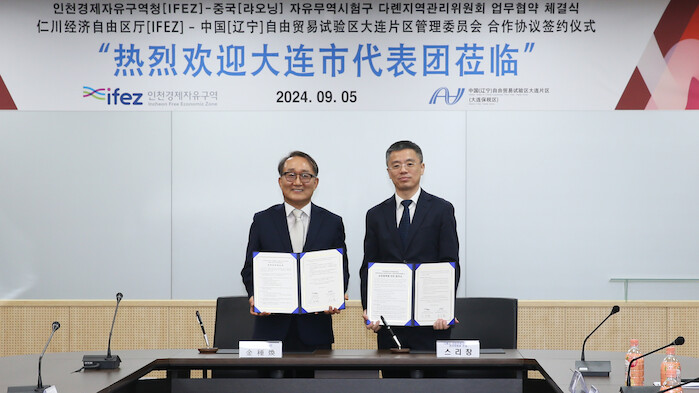 [세계로컬타임즈 이지안 기자]인천경제자유구역청은 5일 송도국제도시 G타워에서 윤원석 청장과 슝마오핑 중국 다롄시 당위원회 서기 등이 참석한 가운데 업무협약을 체결했다고 밝혔다.