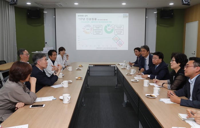 | ▲권선택 시장을 비롯해 대전방문단이 서울 넥슨어린이재활병원 관계자들로부터 2017년 진료현황을 듣고 있다. <사진제공=대전시청> |